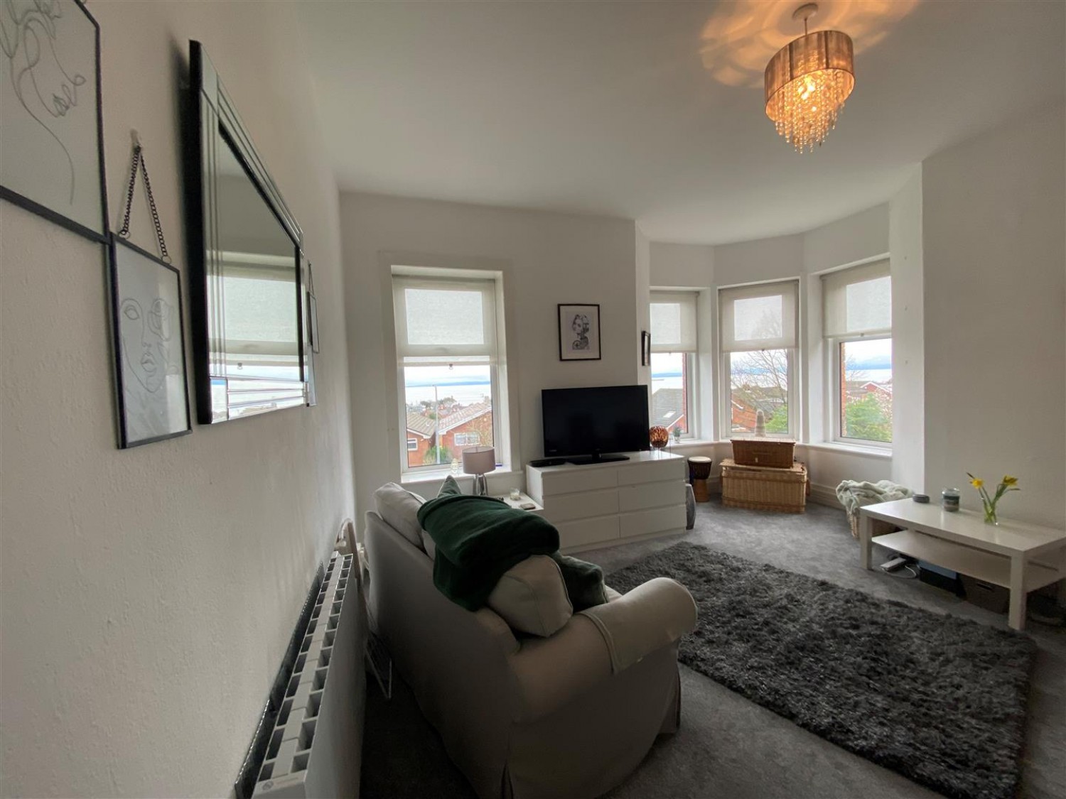 The property briefly comprises an entrance hallway, a bathroom with electric shower, a fitted kitchen with oven and hob, washing machine and fridge/freezer, a double bedroom, and a large, light and sunny bay fronted living room with superb sea views.