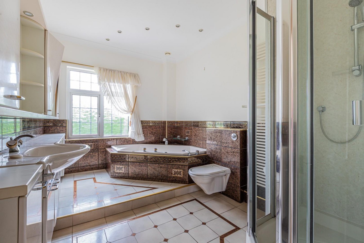 Upon entering, through to the impressive entrance hall, with chandelier and stained glass windows, you are welcomed by four beautifully appointed reception rooms, each designed to cater to various needs, whether it be relaxation, entertainment, or family gatherings.