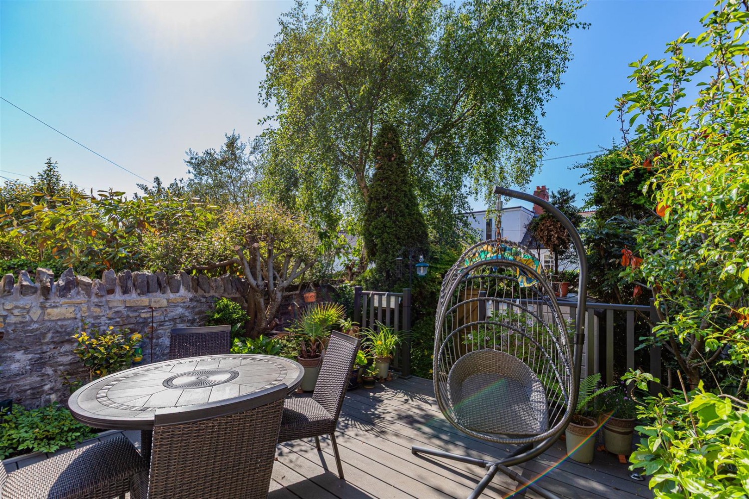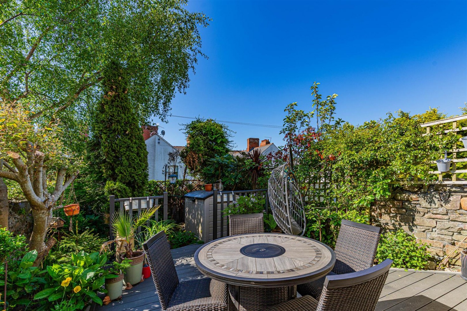 A well maintained garden, with new composite decking, and mature shrubs and plants.