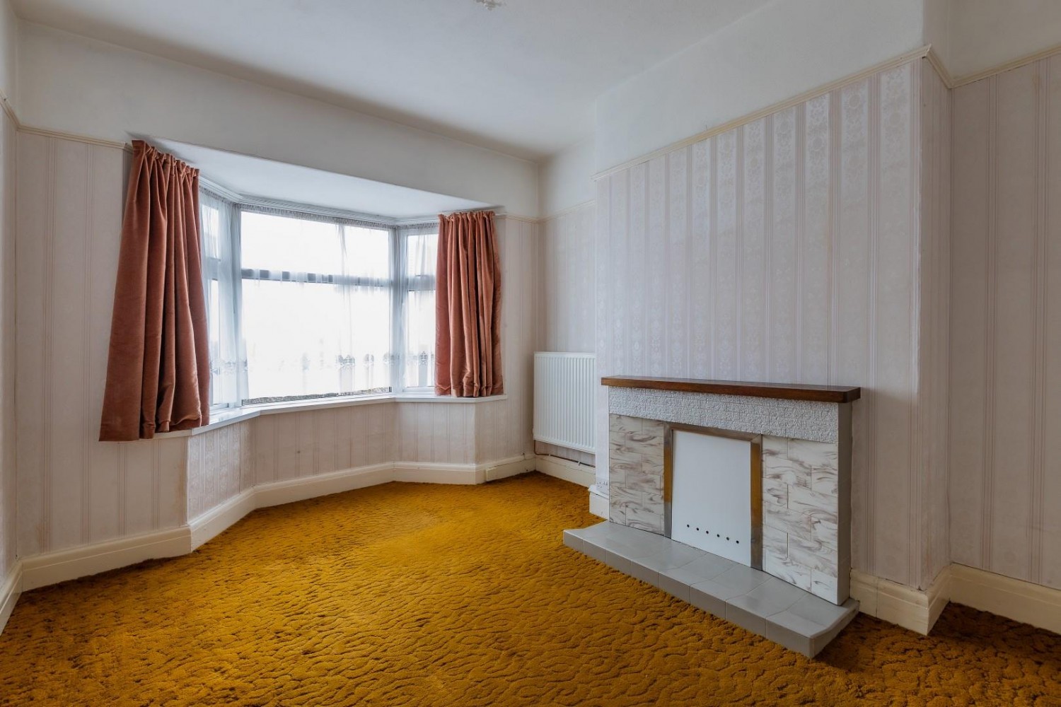 Main living room, bay window to front, tiled period fireplace.